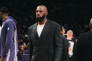詹姆斯晒出一组他身穿西装在现场观众湖人赛季揭幕战的图片,并配文了两个表情:。